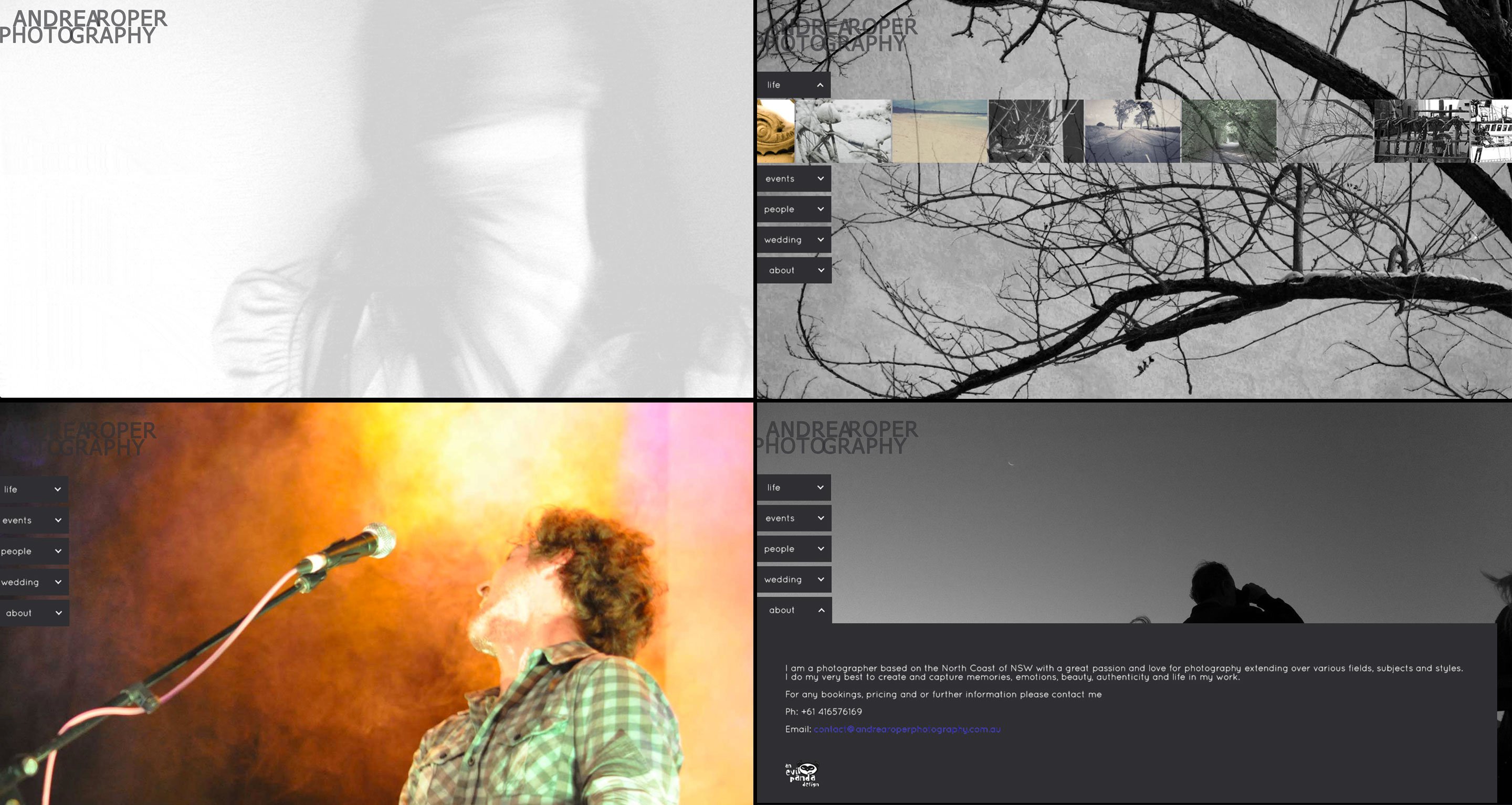 I opted to create a website that utilized a full-screen background gallery to make Andreas photos the focal point of the design. I coupled this with a simple sliding navigation system that provided easy access to content without interfering with the image on display.